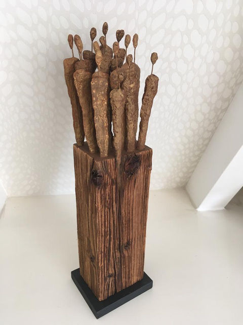 Mes sculptures sont composées d’une structure en métal sur laquelle je façonne un alliage durcissant à base de cellulose, de résines et de colles.
